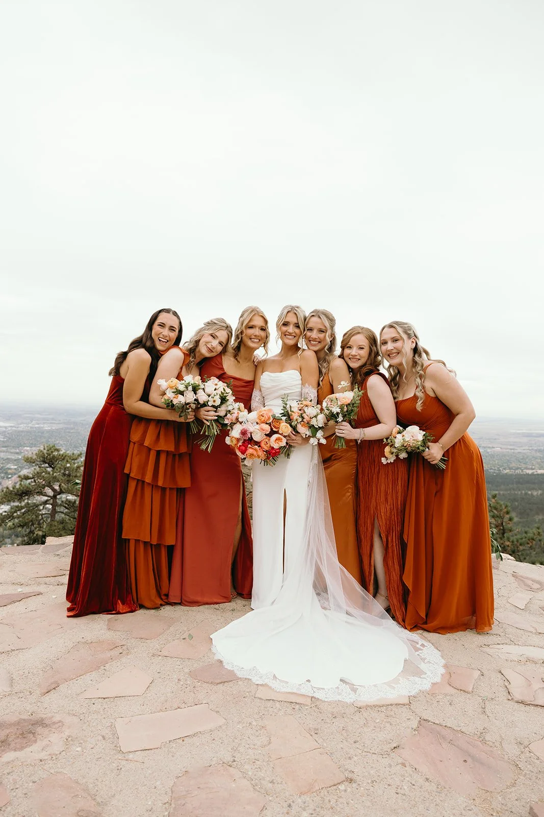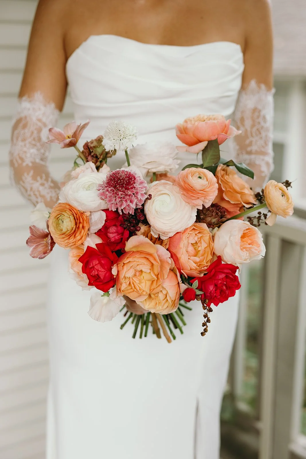 A romantic autumnal palette with hints of orach and pops of vibrant colors for a warm noon October ceremony - design was driven by a flower-forward bridal bouquet and emphasis on overgrown foliage